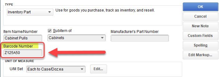 Now what? What did QuickBooks do? It has added a new field in the Item setup screen. When you first turn on the feature, the barcode numbers will be blank. QuickBooks Enterprise can automatically create the barcodes and update this field.