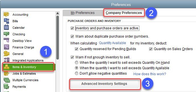 First, from the menu at the top, select Edit > Preferences. Then Items & Inventory > Company Preferences > Advanced Inventory Settings.