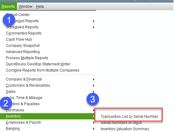 Another way to find serial numbers in QuickBooks is to use the Transaction List by Serial Number Report.