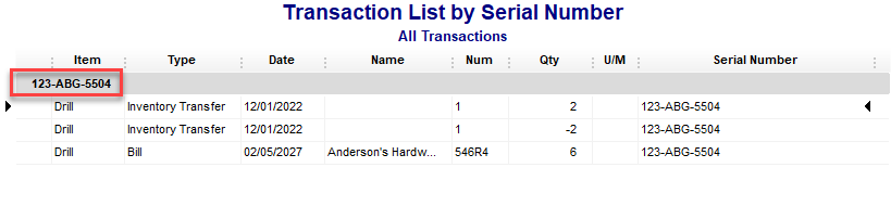 From the menu at the top of your screen, select Reports > Inventory > Transaction List by Serial Number .