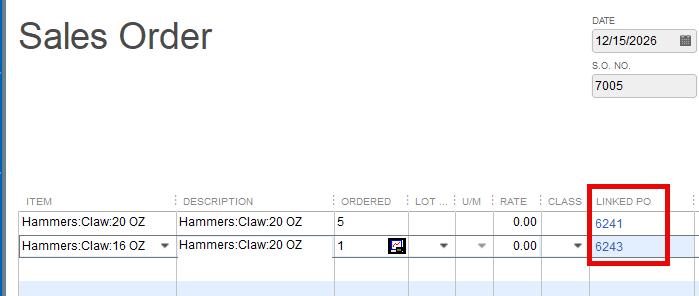 Once enabled, QuickBooks adds a new column on Sales Orders: Linked PO. Clicking the hyperlink will open the Purchase Order.
