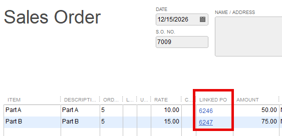This feature provides item-level linking. If you fulfill a Sales Order from multiple suppliers, QuickBooks will show the correct Purchase Order link on each line.