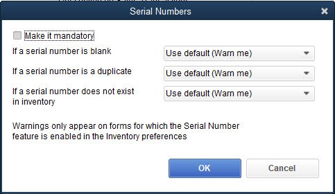 Further options allow you to warn or not warn if a number is blank or does not exist in inventory (for sales and transfers), and serial numbers can also have a warning for duplicates.