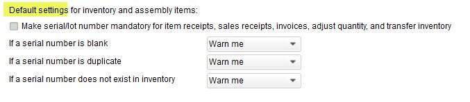 There are default settings that can make serial or lot numbers mandatory for item receipts, sales receipts, invoices, inventory adjustments, and transfers.