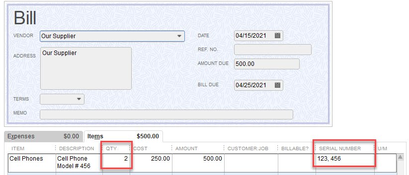 If you buy and sell cell phones, for example, each phone has a separate serial number. So if purchasing 2 phones, there have to be two serial numbers.