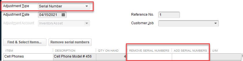The inventory adjustment screen will now show a new option and allow you to remove or add existing lot or serial numbers.