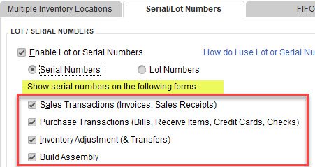 QuickBooks allows you to select the form types you wish to use with lots and serial numbers.