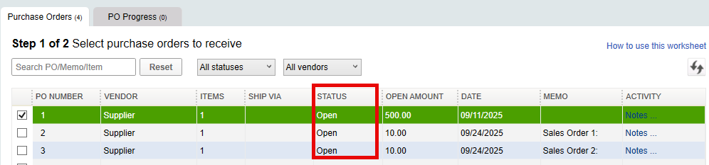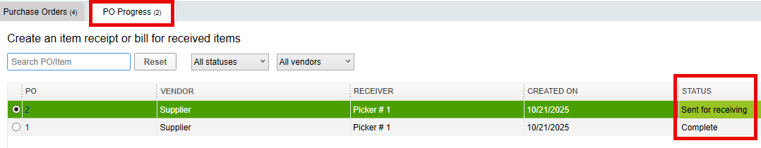 Selecting the PO Progress tab shows the status of any orders sent for receiving.