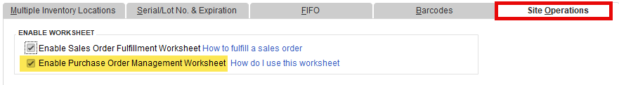 Select the Site Operations tab > Enable Purchase Order Management Worksheet.